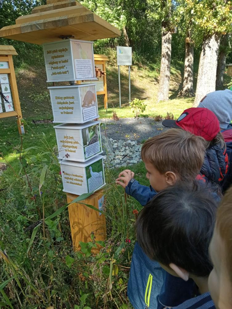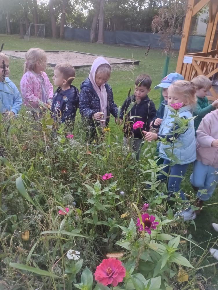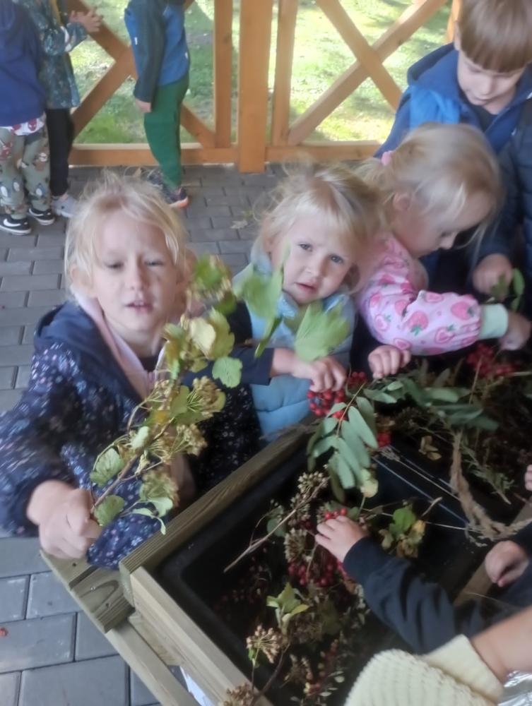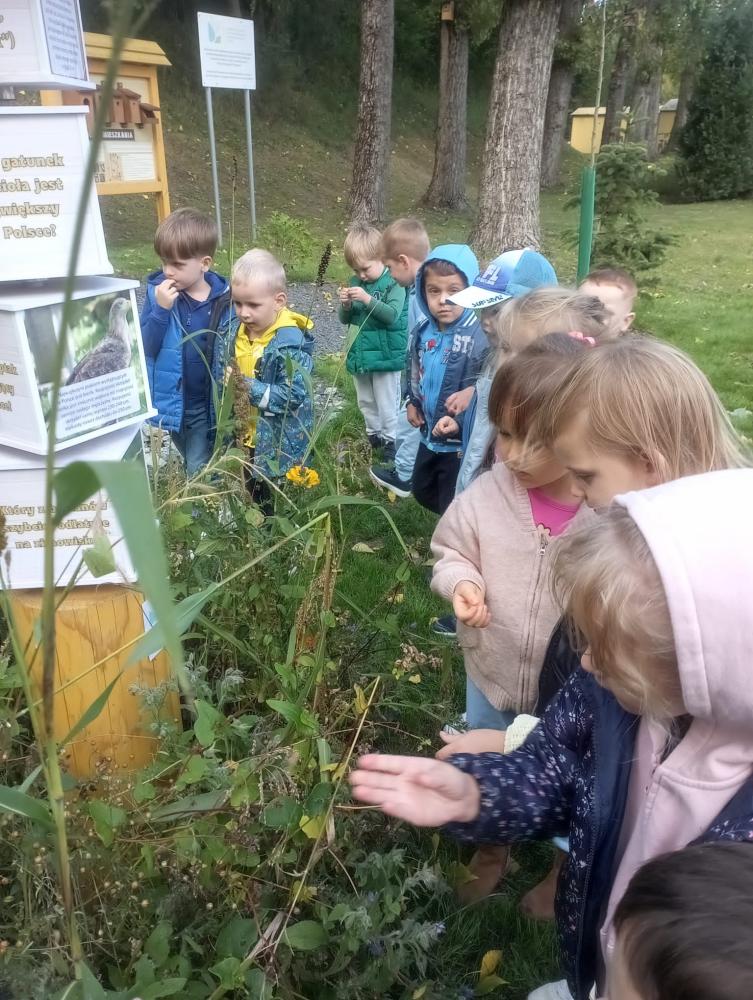 Dzieci ze wszystkich grup wiekowych naszego przedszkola we wrześniu uczestniczyły w zajęciach i zabawach w „Ptasim zagajniku” podczas, których dowiedziały się jakie drzewa rosną w punkcie dydaktycznym, a ich owoce są pokarmem dla ptaków – jarzębina, głóg, wiśnia, orzech włoski. Przedszkolaki oprócz drzew, miały możliwość obserwacji znajdującego się w naszym punkcie dydaktycznym „żywego karmnika”, w którym rosną rośliny i krzewy, a ich nasiona są również pokarmem dla ptaków – jeżówka, berberys, dzika róża, proso i inne.