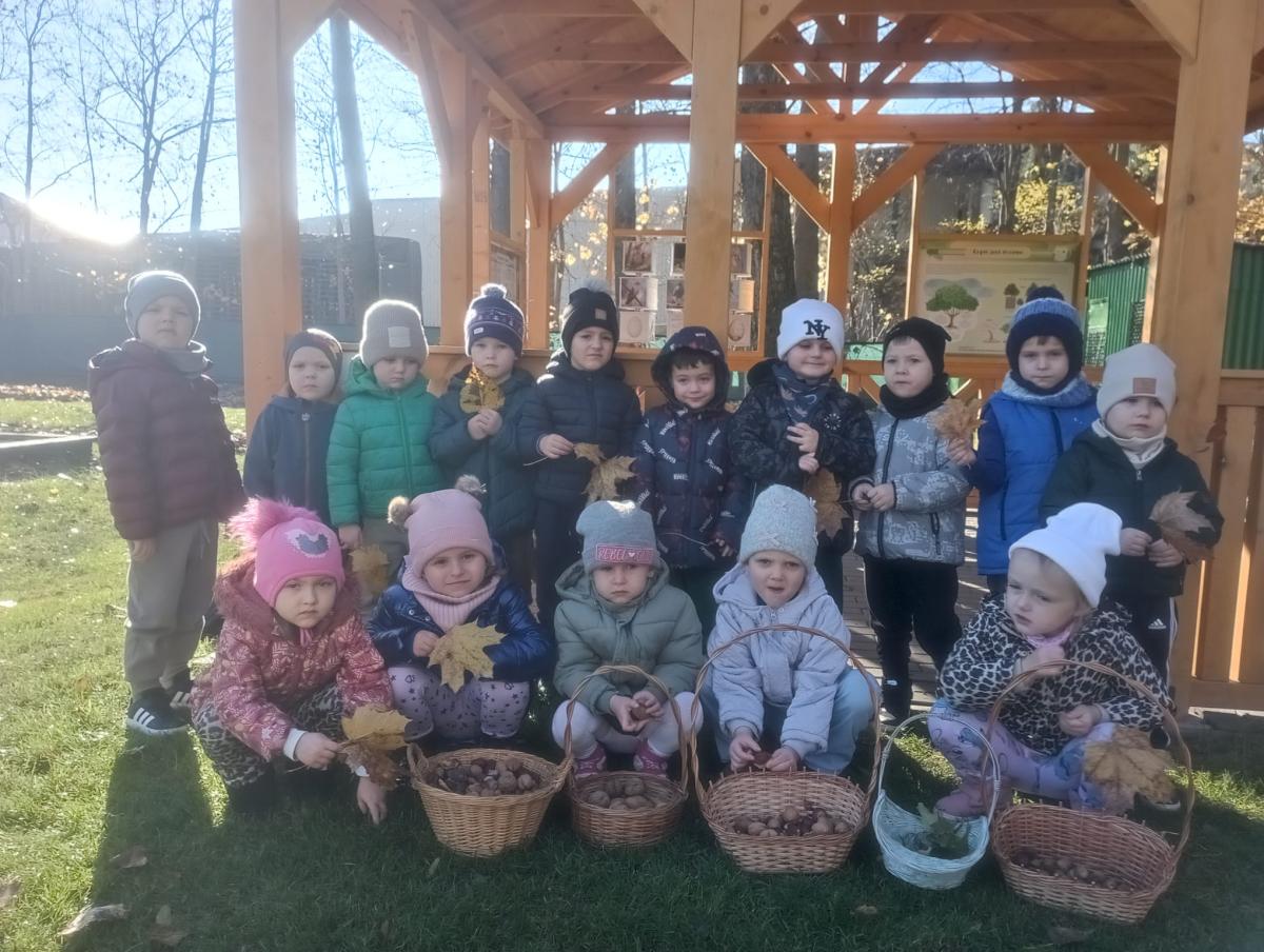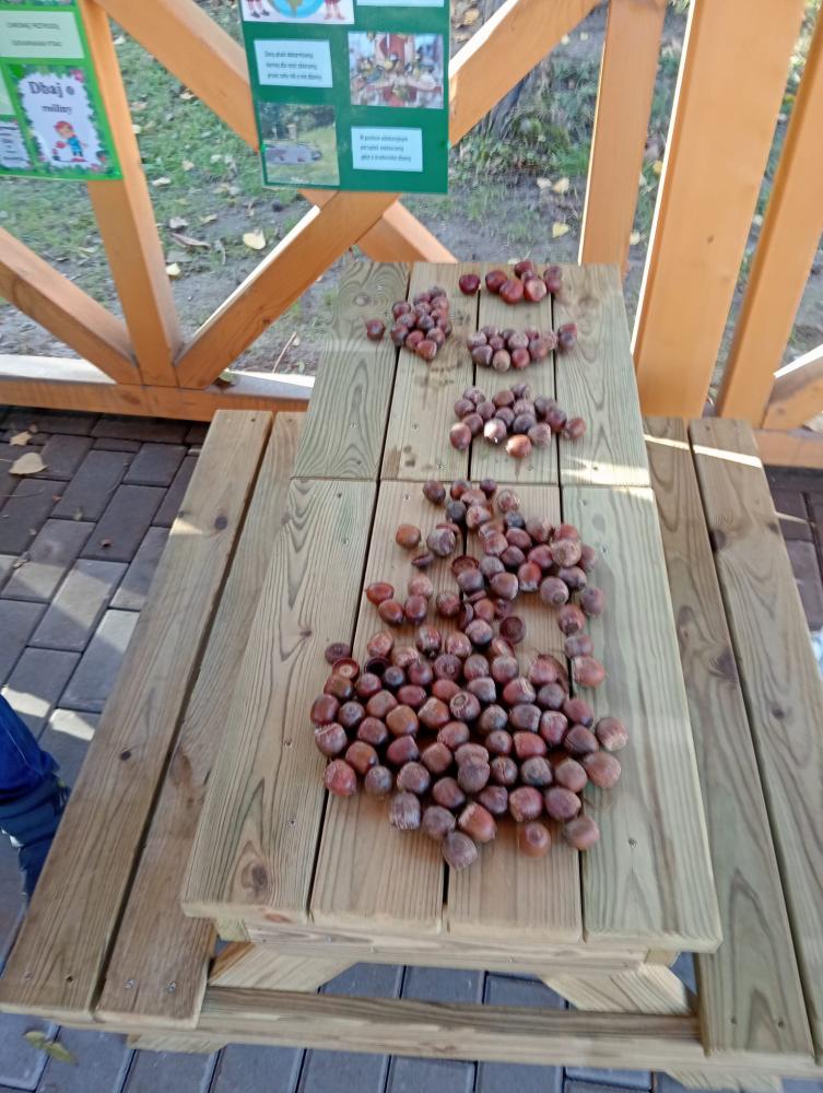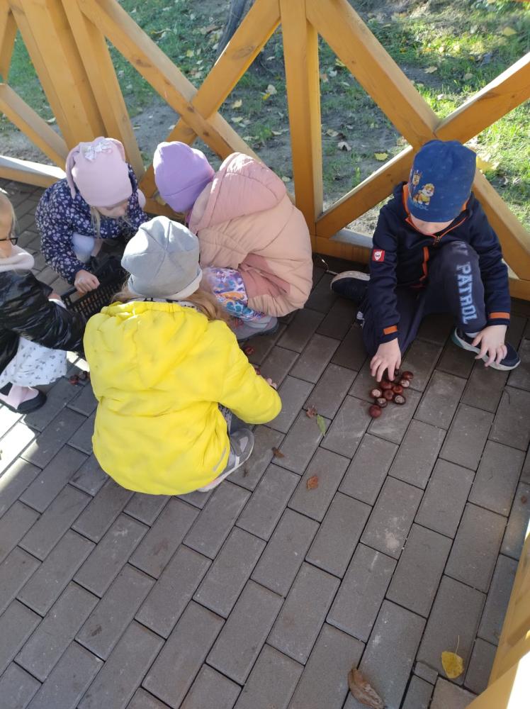 Pogoda dopisała i można było pozbierać materiał przyrodniczy do zabaw w punkcie dydaktycznym „Ptasi zagajnik”. Przedszkolaki zbierały żołędzie, kasztany i kolorowe liście, wszystko to zostało zgromadzone w altanie.