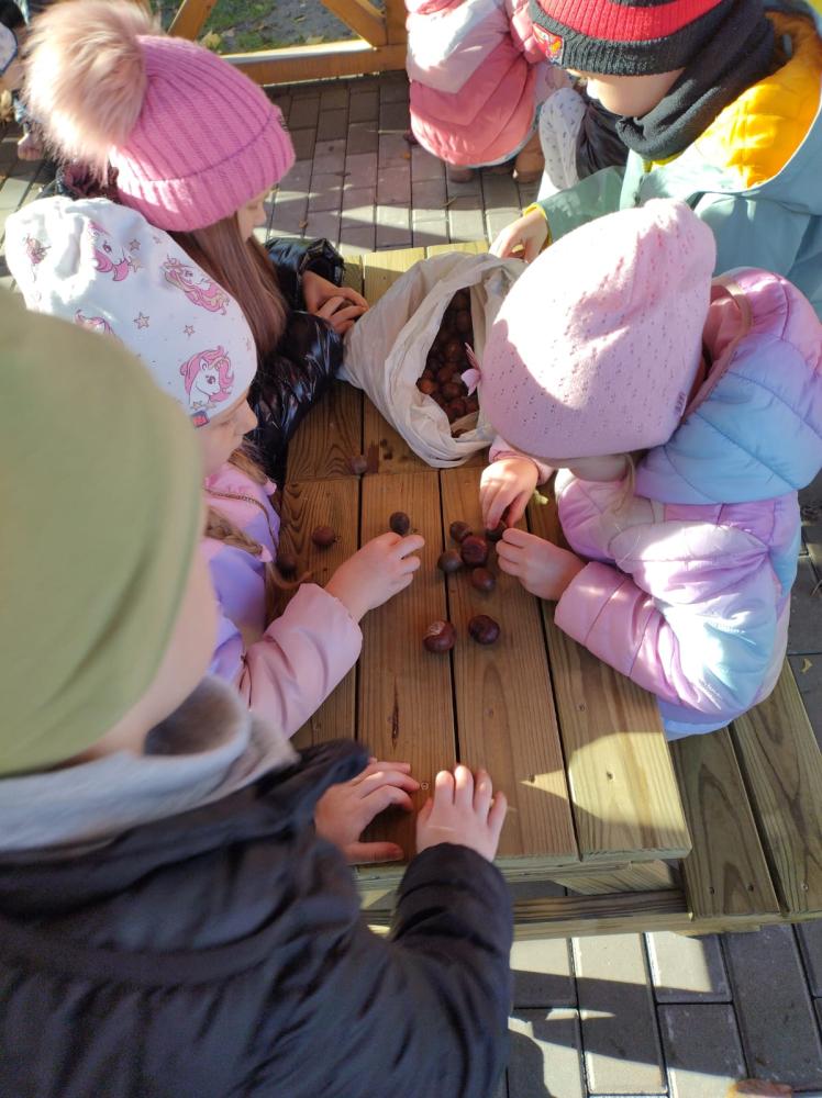 „Jesienne skarby” – na początku listopada dzieci z przedszkola wzięły udział w zajęciach w ramach edukacji przyrodniczej na świeżym powietrzu.