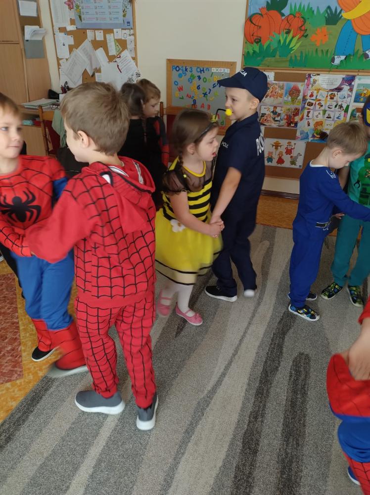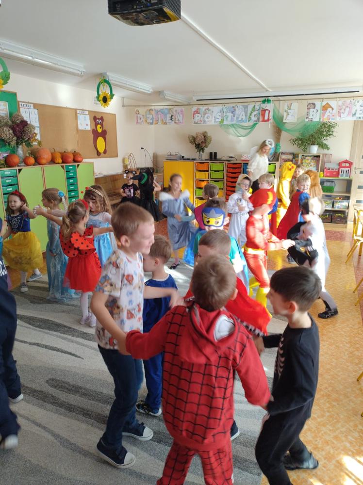 Dzieci przyszły przebrane za swoich ulubionych bohaterów bajkowych i z entuzjazmem uczestniczyły w tańcach oraz zabawach przy znanych melodiach z bajek. Dzieci doskonaliły koordynację ruchową, poczucie rytmu oraz współpracę w grupie. Świetnie wykonywały wszystkie zadania. Zajęcia przebiegały w radosnej, bajkowej atmosferze, dostarczając dzieciom wielu pozytywnych emocji.