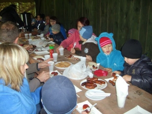 Po leśnej wędrówce na wszystkich czekała gorąca herbata, bigos i kiełbaski pieczone na ognisku przygotowane przez panie kucharki z naszego przedszkola.
