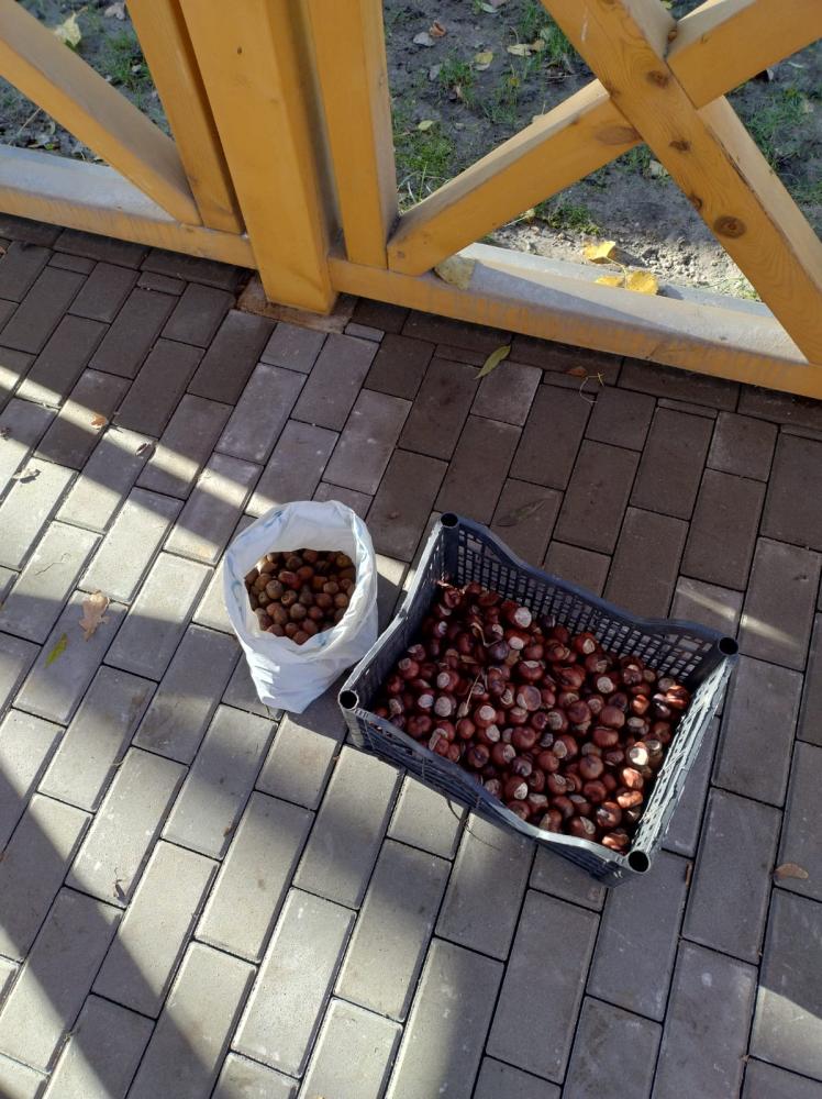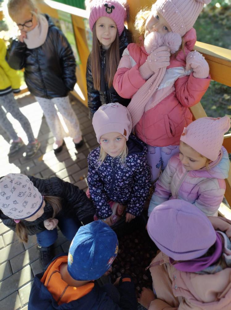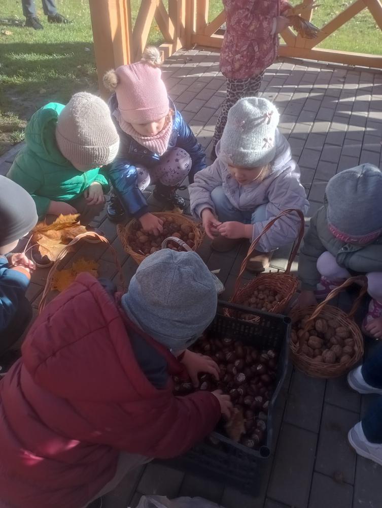 Pogoda dopisała i można było pozbierać materiał przyrodniczy do zabaw w punkcie dydaktycznym „Ptasi zagajnik”. Przedszkolaki zbierały żołędzie, kasztany i kolorowe liście, wszystko to zostało zgromadzone w altanie.