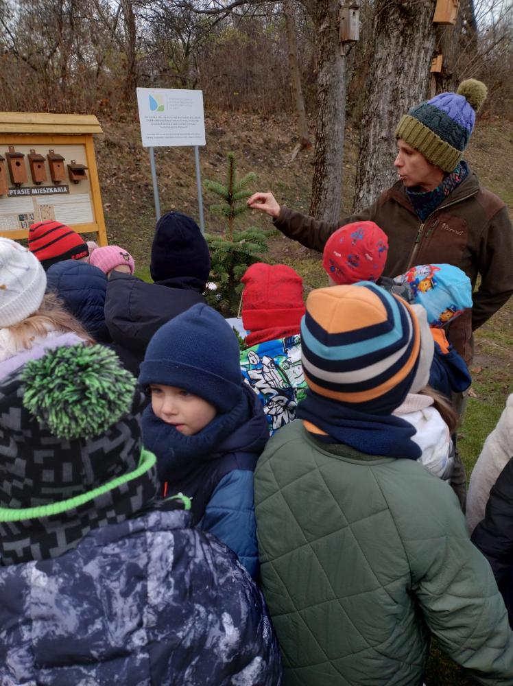 Przedszkolaki wraz z Panią leśnik odczytywały wiadomości znajdujące się na tablicach informacyjnych. Zajęcia w terenie są dobrą lekcją z poznawania teorii w praktyce.