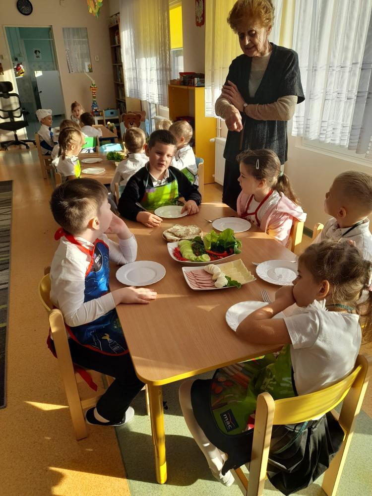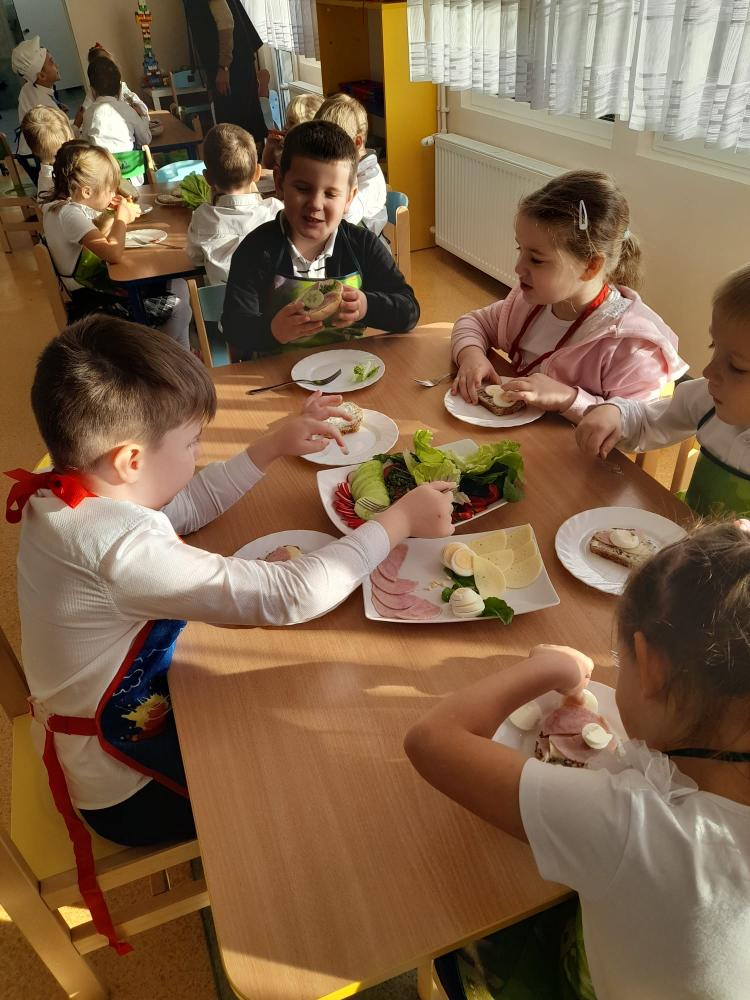 W dniu 07.11.2025r.( piątek) dzieci 5- letnie z grupy Pszczółek Publicznego Przedszkola nr 1 przygotowywały na śniadanie kanapki pełne zdrowia.