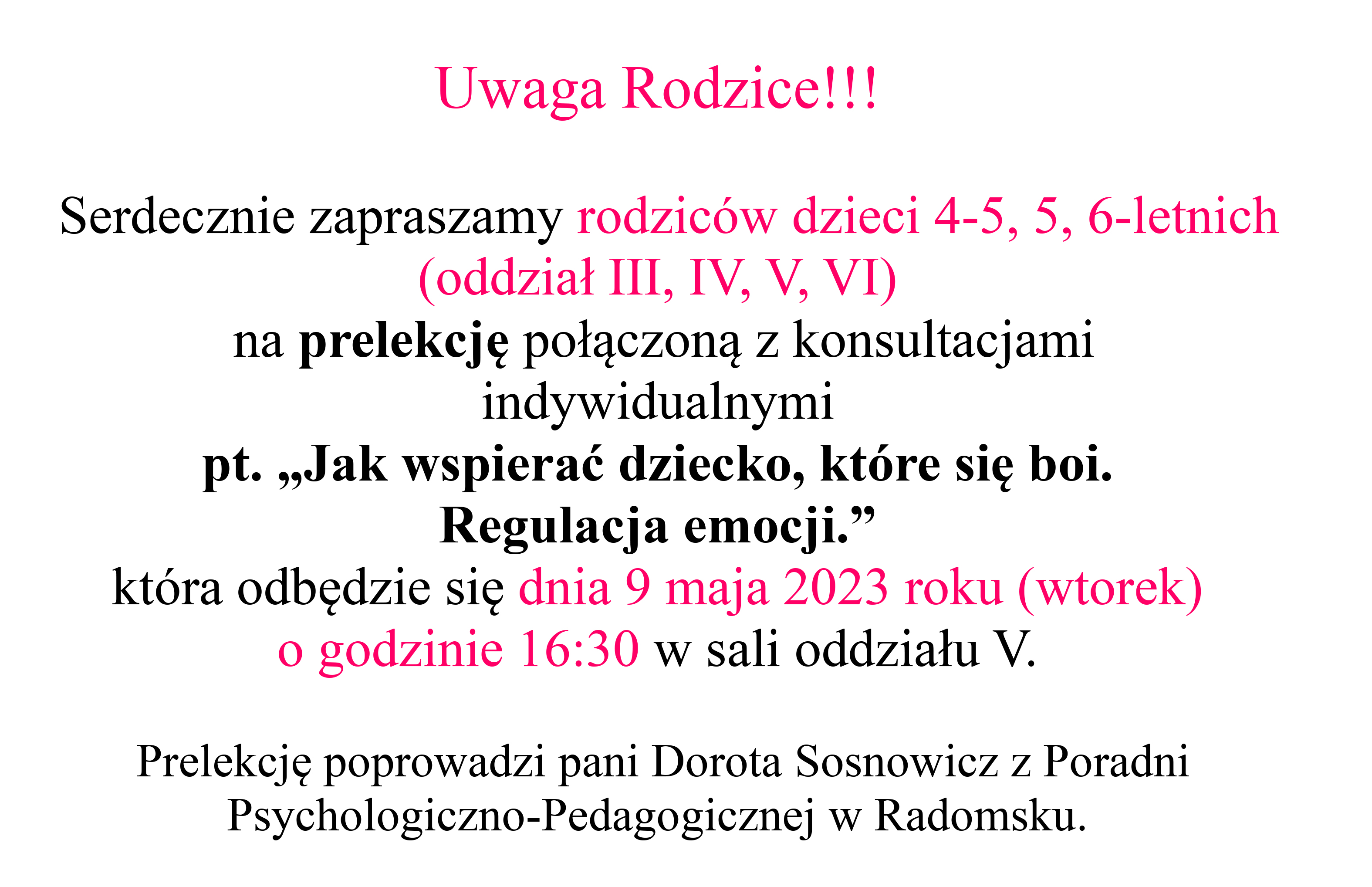Prelekcję poprowadzi pani Dorota Sosnowicz z Poradni Psychologiczno-Pedagogicznej w Radomsku.