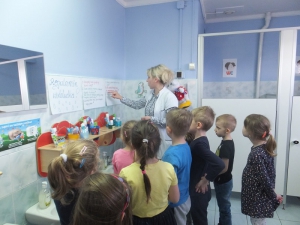 W spotkaniu z Panią pielęgniarką dzieci wszystkich grup wiekowych wysłuchały wiersza pt: "Precz z wodolejstwem", zostały zapoznane z "Regulaminem wodoludka", mówiącym o zasadach oszczędzania wody zarówno w domu jak i w przedszkolu.