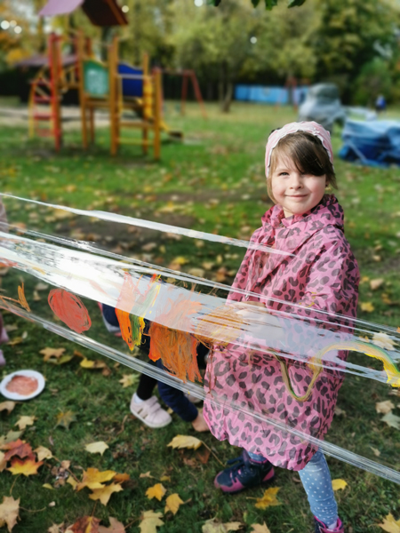 Przedszkolaki wykonały jesienne pejzaże na folii. Zajęcia odbyły się na naszym placu przedszkolnym.