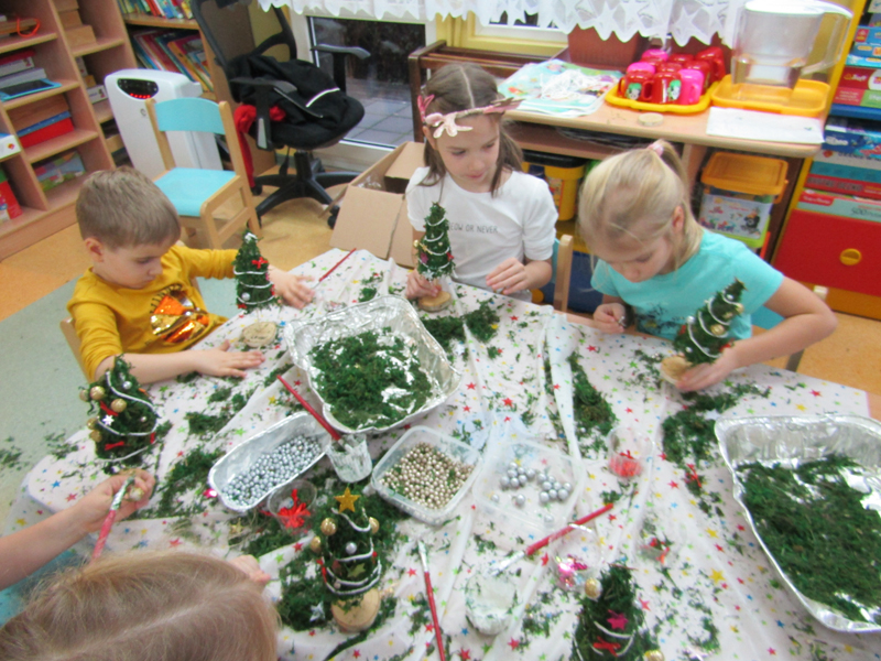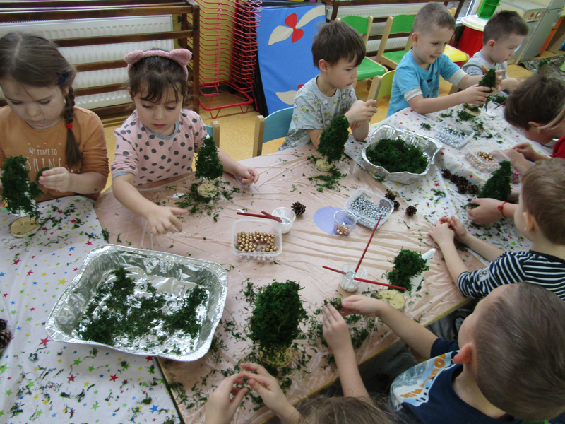 Dnia 16 grudnia 2021r. dzieci z wszystkich grup wiekowych brały udział w warsztatach pt. „Bożonarodzeniowe drzewko – dekorowanie choinki wykonanej z mchu”. Zajęcia przeprowadzili animatorzy z Ośrodka Pozytywnie Kreatywni z województwa kujawsko – pomorskiego.